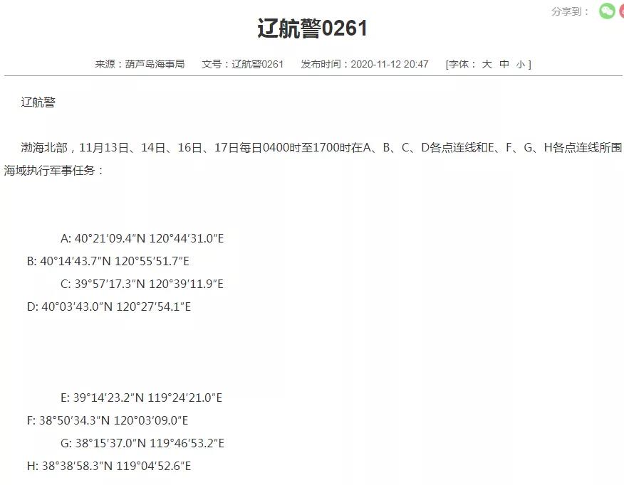 渤海北部,11月13日、14日、16日、17日每日0400时至1700时在A、B、C、D各点连线和E、F、G、H各点连线所围海域执行军事任务: